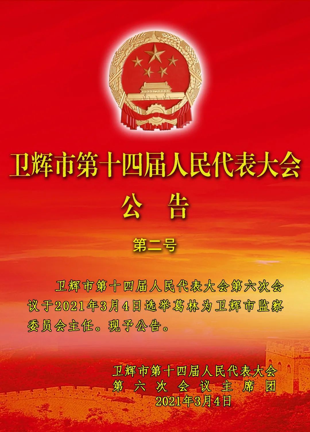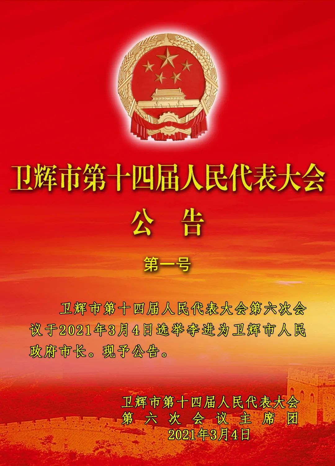 卫辉市第十四届人民代表大会公告