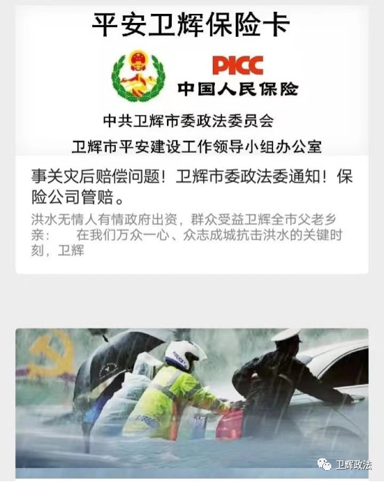 洪水无情人有情,政府出资,群众受益。受今年7.20暴雨影响,我市群众家庭住房受到不同程度淹泡等损失。灾情发生后,市委政法委第一时间召集社会治安保险承保单位,协调理赔相关事宜。