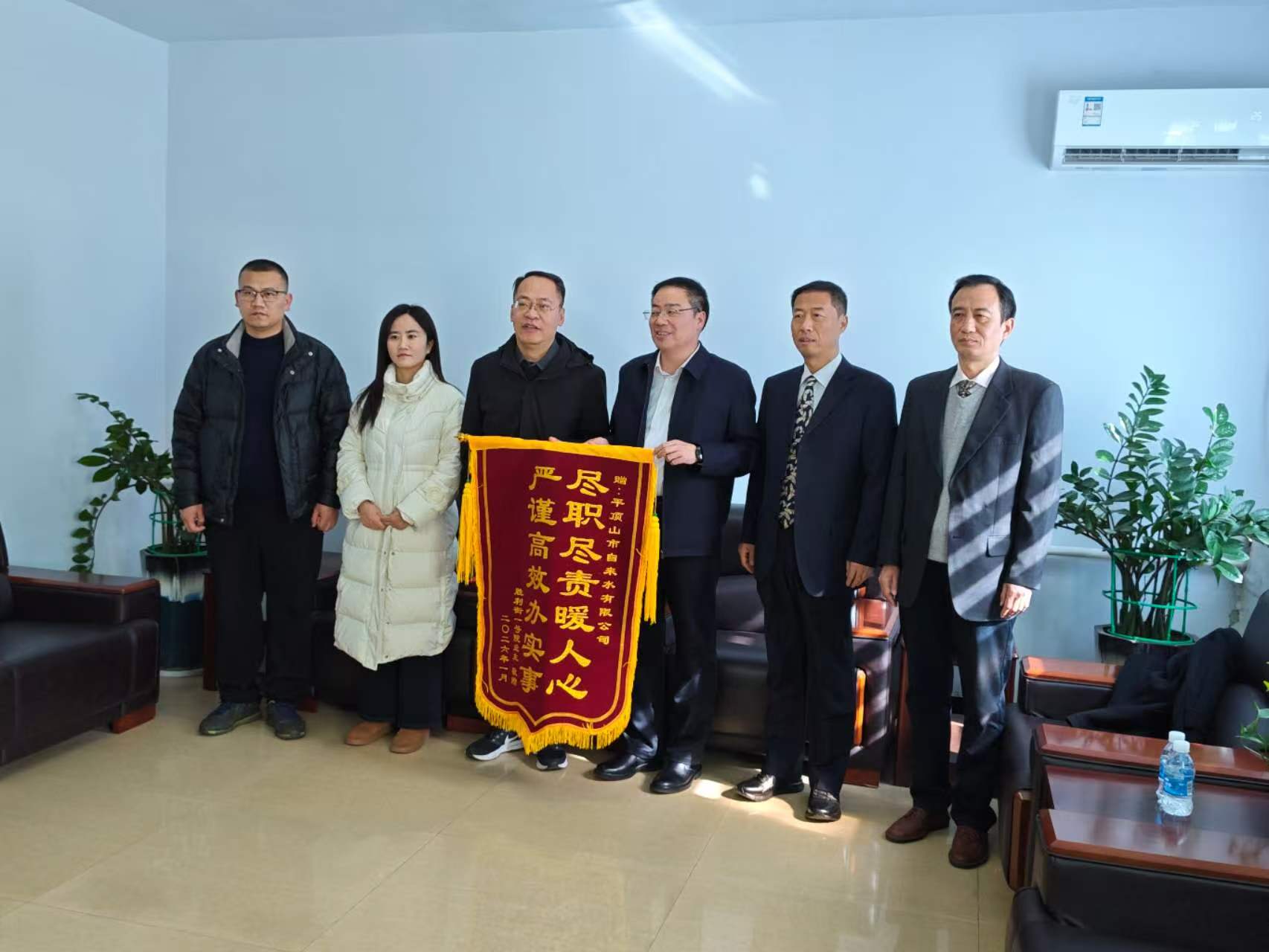 2月10日下午,新华区人大代表、矿工路街道党工委书记潘栋、办事处主任肖羽、矿工路街道人大工委主任胡楷彤带队,走访慰问市自来水公司、平煤物业服务中心、平煤现代服务分公司等企业,送上锦旗与感谢信及新春祝福。